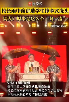 9月3日晚,浙江工业大学举行2025级本科生开学典礼。有网友发布视频称,当晚突降大雨,2名学生上去给正在演讲的校长撑伞,却正好把两把雨伞之间的空隙留给了校长,这个画面被网友戏称为“双一流”。