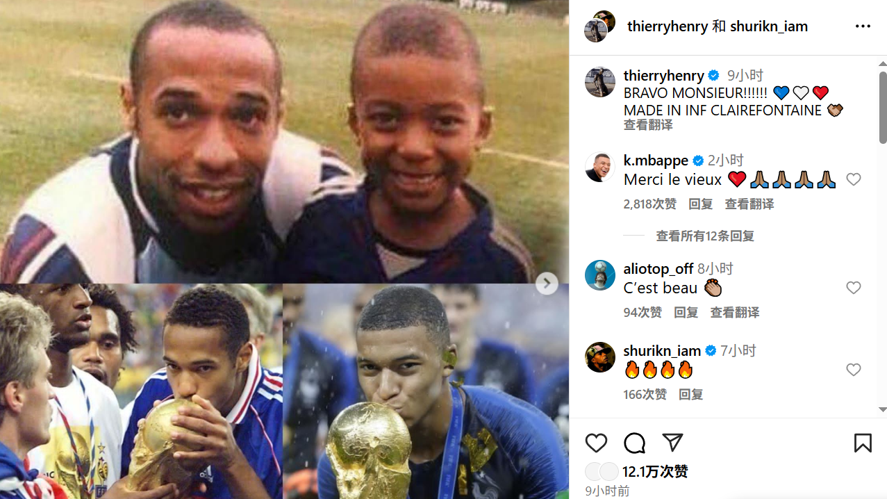 亨利贴出一组图片,有他和童年时期的姆巴佩的合影,也有两人以非常接近的姿势亲吻世界杯冠军奖杯的画面。还有两人进球后围绕角旗杆庆祝的画面。